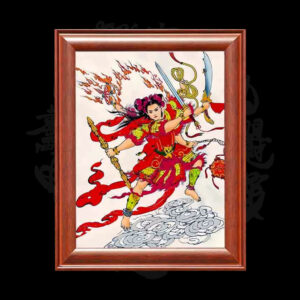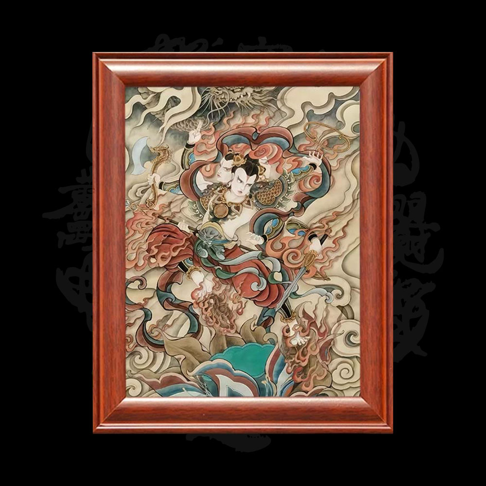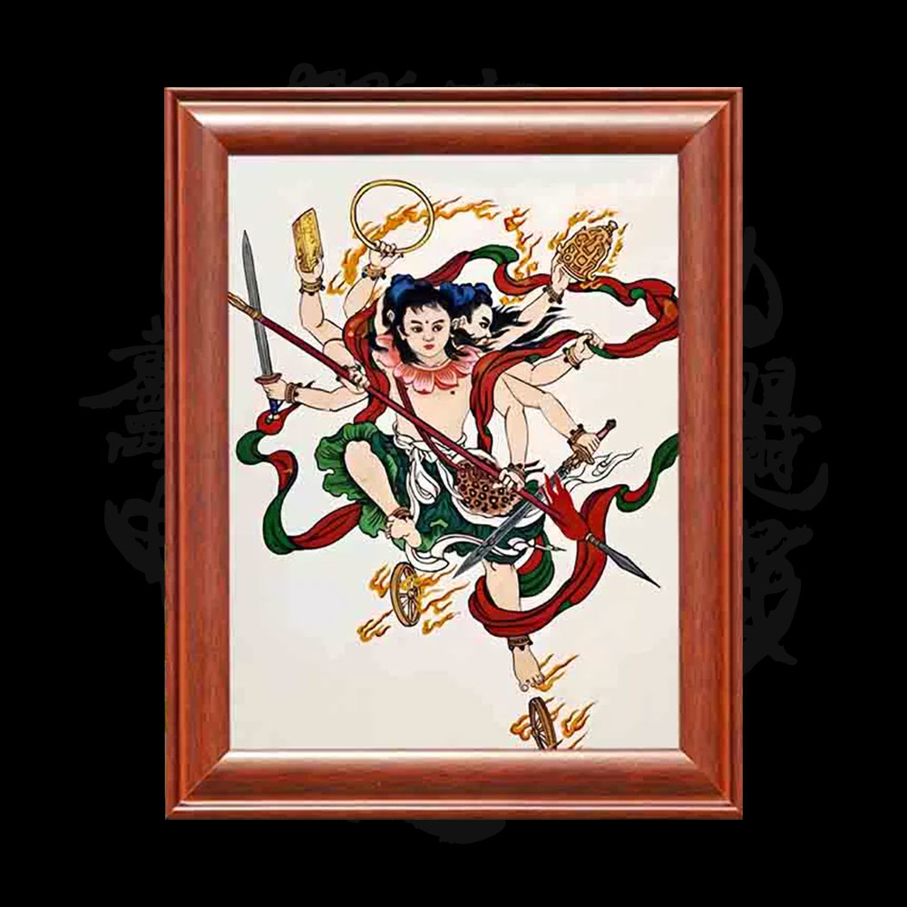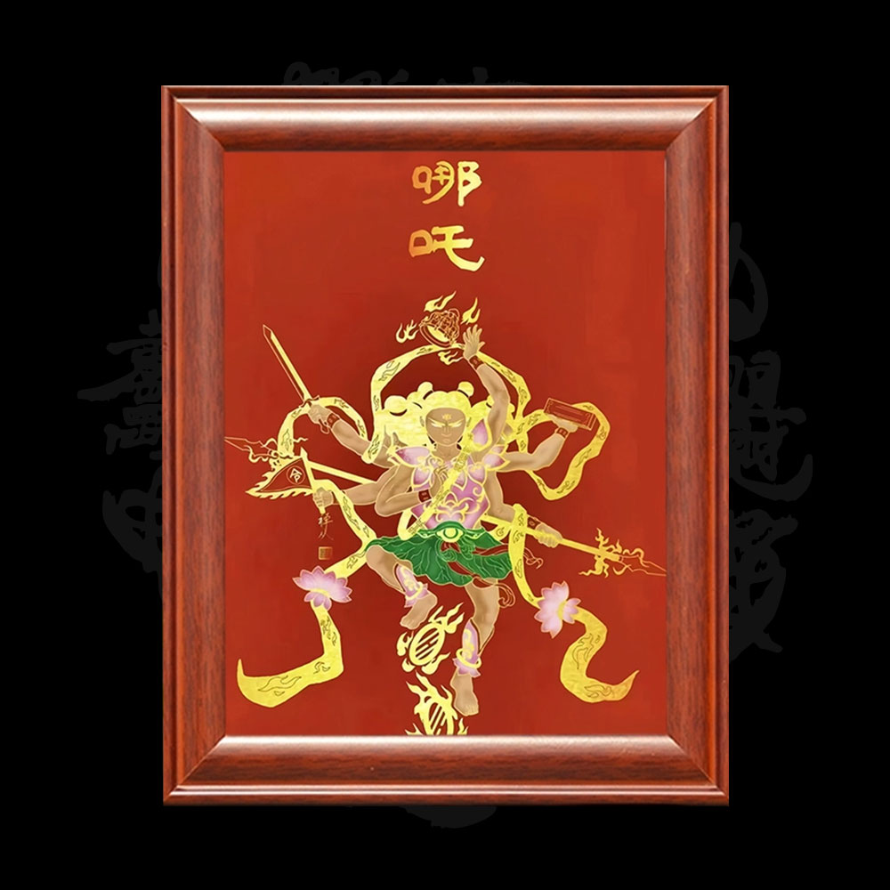 Nezha, the Third Prince, is a deity who can be displayed in the living room or central hall. He is also depicted in a solid wood frame.